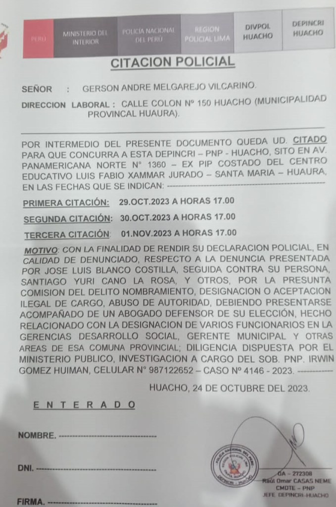 El alcalde provincial Santiago Cano La Rosa y sus regidores oficialistas, tendrán que comenzar a desfilar a dar sus manifestaciones ante la DIPINCRI, a partir del domingo 29 en que ha sido citado, en primer lugar el regidor provincial Gerson Andre Melgarejo Vilcarino.