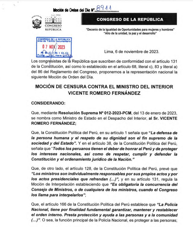 Debido a la alta criminalidad que se ha registrado en el país, el Congreso decidió presentar una moción de censura contra el titular del Ministerio del Interior, Vicente Romero debido a que consideran que hay una «incapacidad» para asumir su gestión en este sector que viene siendo afectado por delicuentes.