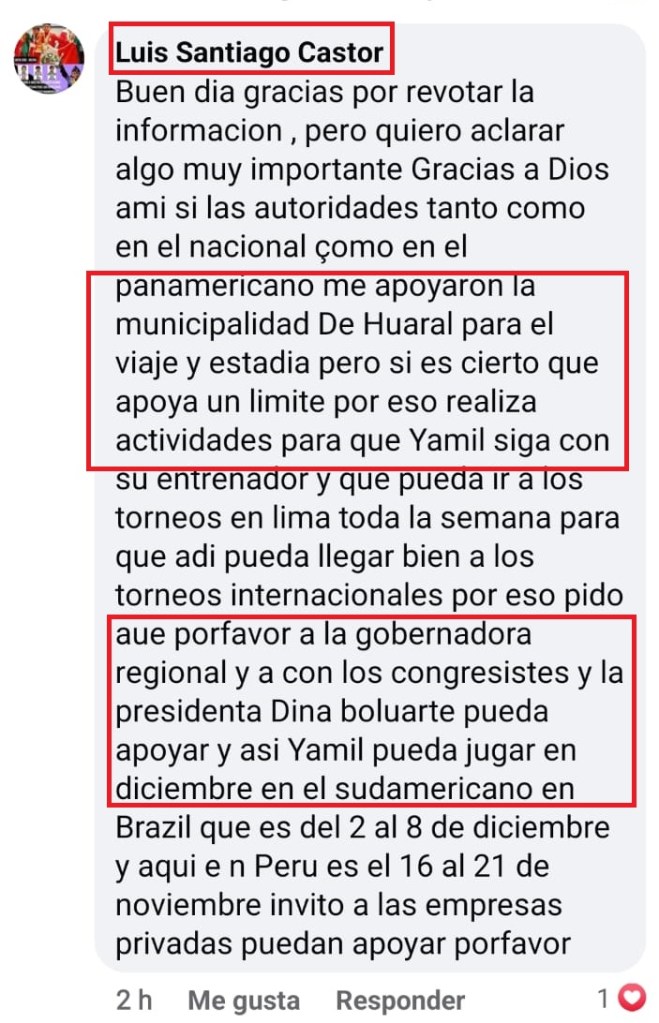 Tras ello, el padre de Yamil, Luis Santiago Castor, no se calló y contestó el post explicando que la “pollada pro fondos” es para costear más gastos que requiere su hijo para participar en otros campeonatos.