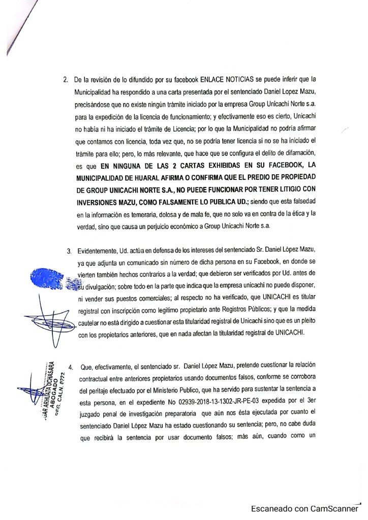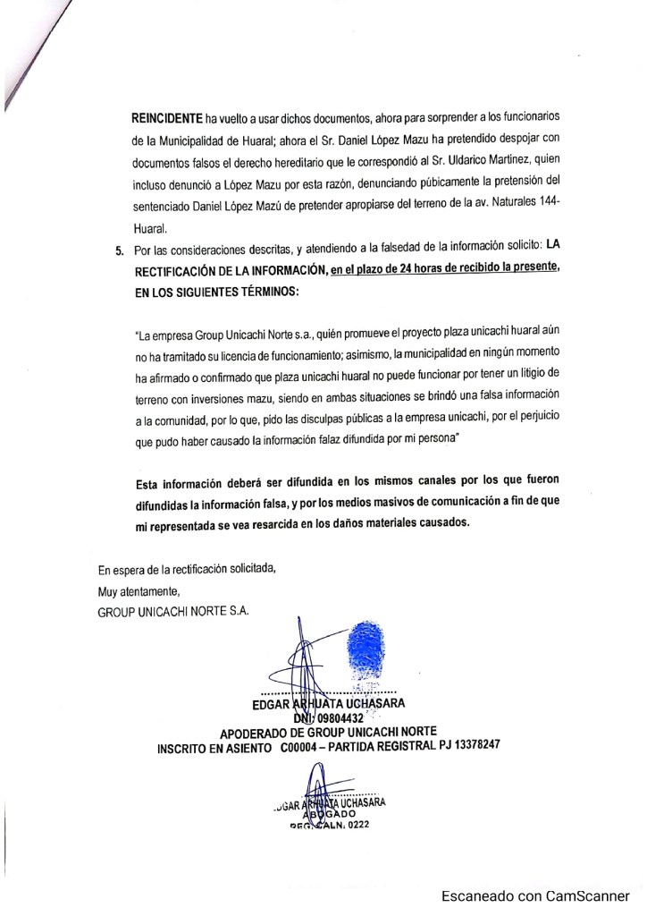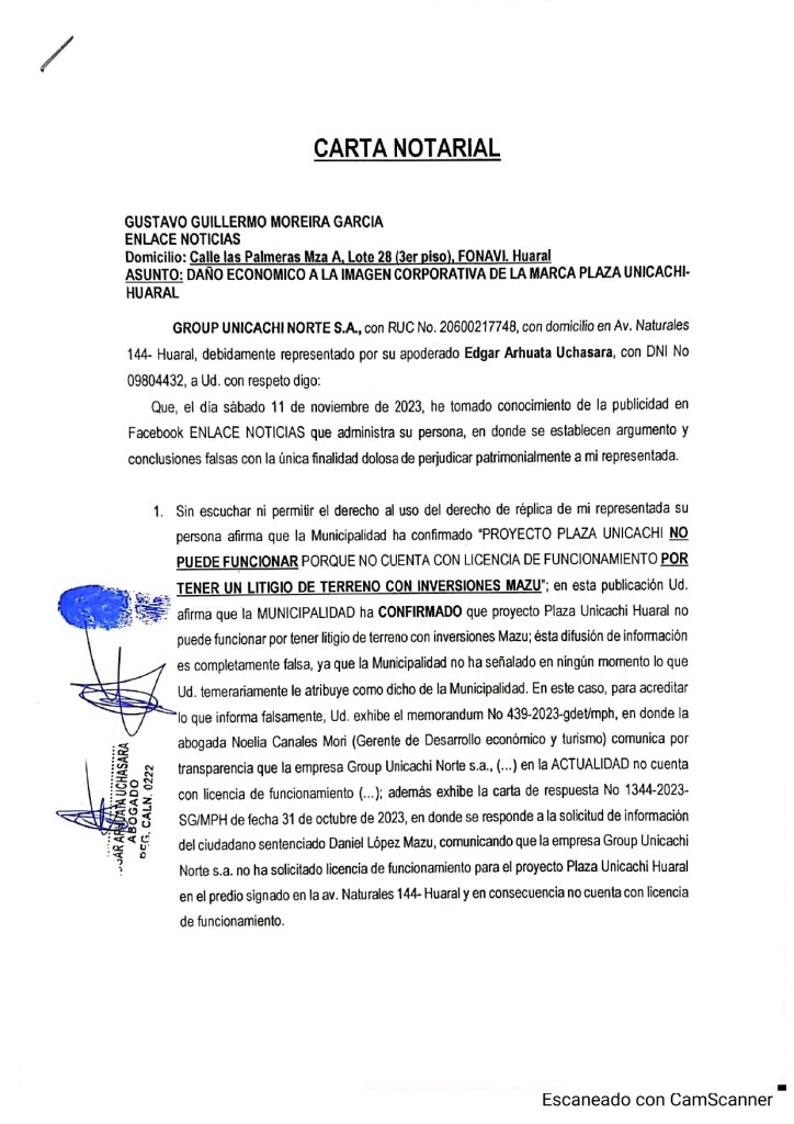 Frente a información tendenciosa que afirma:  ¡Municipalidad confirma! proyecto “Plaza Unicachi Huaral” no cuenta con licencia de funcionamiento por litigio de terreno con Inversiones Mazu Sac”, sin brindarles el derecho de fundamentar por que les corresponde obtener la licencia de funcionamiento, mediante un procedimiento administrativo regular y legal, anuncia que de no ser rectificada la información tomarán las medidas correspondan, por lo que le brindan 24 horas a partir de la notificación de la carta notarial que le están enviando al responsable la página de Facebook “Enlace Noticias”.
