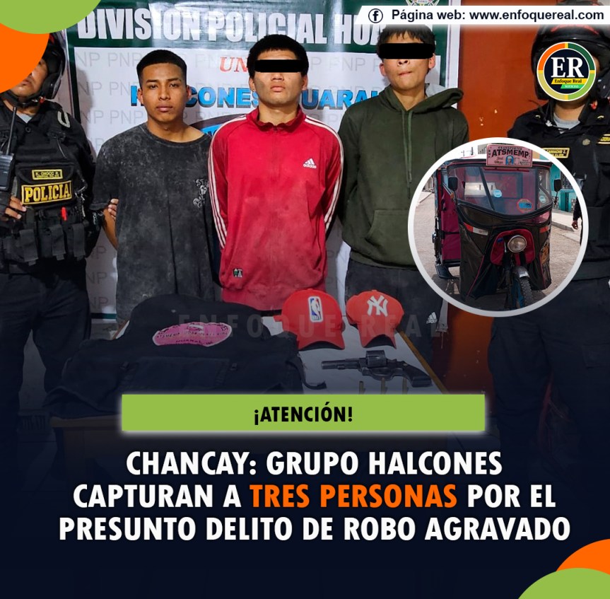 Personal policial del grupo motorizado Halcones en momentos que se encontraban realizando el patrullaje motorizado por diversas zonas del distrito de Chancay fueron alertados sobre el robo a dos ciudadanos en la puerta del mercado de Abastos del indicado distrito, por lo que de inmediato se ejecutó un operativo policial logrando la captura de los presuntos delincuentes. Hecho ocurrido la tarde de este jueves, a las 11:50 de la mañana en la avenida Primavera.