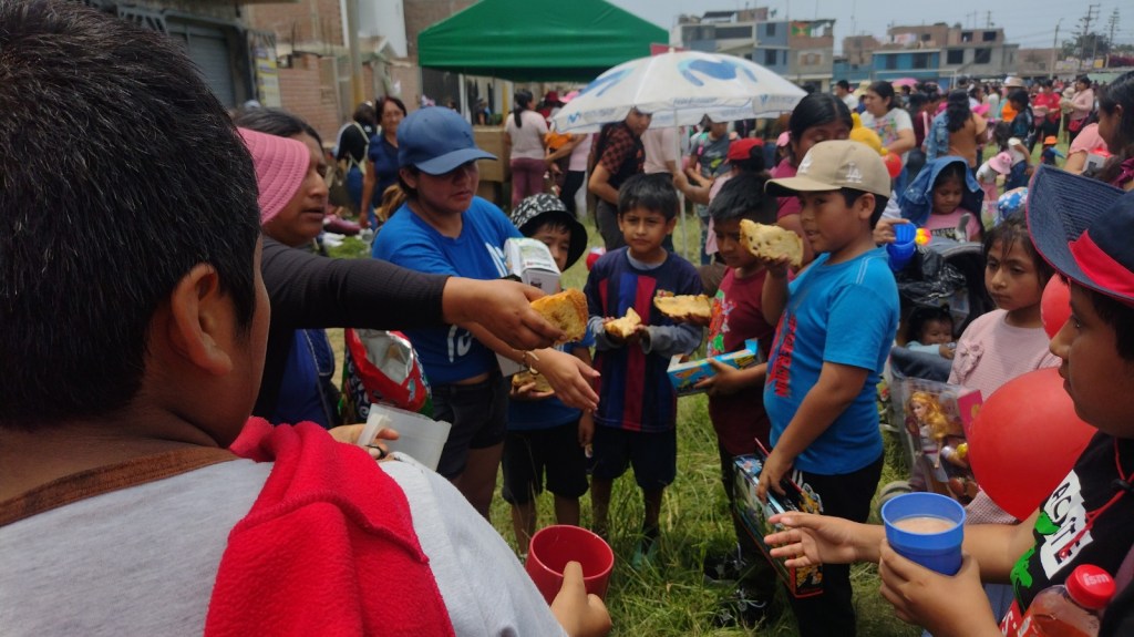 Y no podía faltar la Chocolatada y el rico panetón que entregaban las madres de la Junta Directiva a los niños y madres presentes