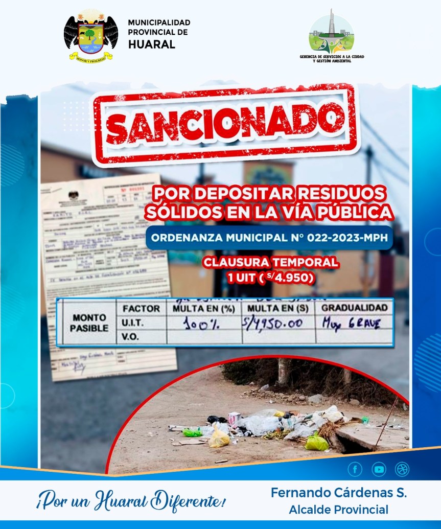 Con firme compromiso de velar por el cuidado de nuestro medio ambiente, la Municipalidad Provincial de Huaral, a través de la Gerencia de Servicios y Gestión Ambiental y la Gerencia de Fiscalización y Control, sancionó en la víspera a un establecimiento comercial por dejar sus residuos sólidos en la vía pública.