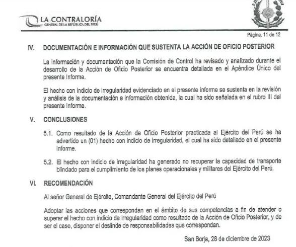 Finalmente, la irregularidad que quedó registrada por la Contraloría solo recomendó al comandante General del Ejército que “adopte las acciones que corresponden en el ámbito de sus competencias a fin de atender o superar el hecho como indicio de irregularidad y, de ser el caso, disponer el deslinde de responsabilidades que corresponde”.