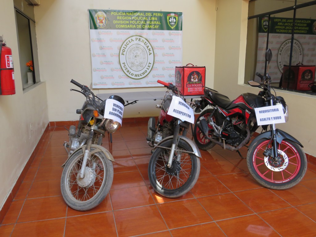 Tras un trabajo de inteligencia, la madrugada de este viernes la PNP de la comisaría de la ciudad de Chancay pudo recuperar tres motos lineales y una mototaxi, en la prolongación López de Zúñiga, barrio Hindú, en el distrito portuario, según narró el jefe de la División Policial de Huaral, Crnl. Alberto Laureano, a los medios de comunicación.