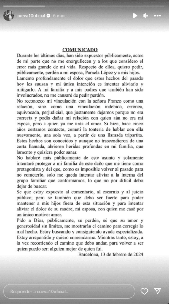 Luego, Cueva se refirió a la relación extramatrimonial que sostuvo con Pamela Franco. «Fue una vinculación indebida, errónea, equivocada, perjudicial, que justamente dejamos porque no era correcta… Si bien hace cinco años cortamos contacto, cometí la tontería de hablar con ella (Pamela Franco) nuevamente, una sola vez, a partir de una llamada tripartita. Estos hechos son conocidos y aunque no trascendieron, abrieron heridas profundas en mi familia, que lamento y quisiera poder sanar», manifestó.