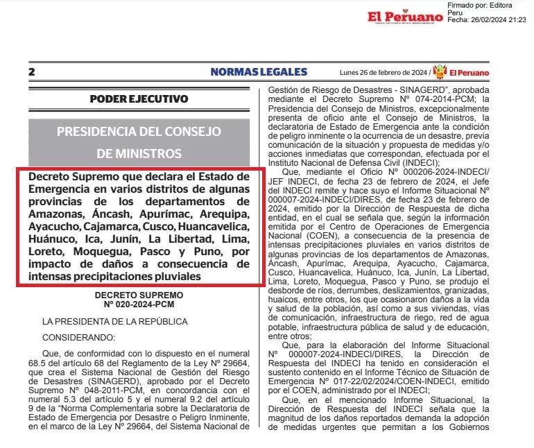 En edición extraordinaria de las Normas Legales del diario El Peruano, el Poder Ejecutivo oficializó la declaratoria del estado de emergencia en 100 distritos del territorio peruano por los daños ocasionados por las intensas lluvias. Según se detalló la medida aplica en las regiones de Amazonas, Áncash, Apurímac, Arequipa, Ayacucho, Cajamarca, Cusco, Huancavelica, Huánuco, Ica, Junín, La Libertad, Loreto, Moquegua, Pasco, Puno y Lima.