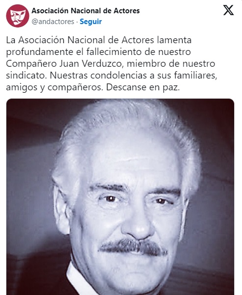 «La Asociación Nacional de Actores lamenta profundamente el fallecimiento de nuestro compañero Juan Verduzco, miembro de nuestro sindicato. Nuestras condolencias a sus familiares, amigos y compañeros. Descanse en paz», señalaron.