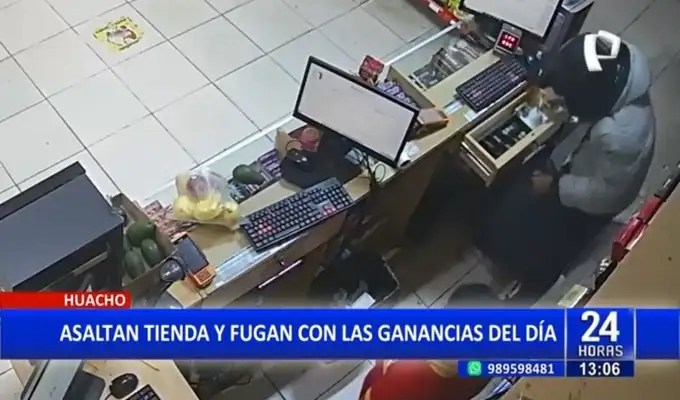 Según las imágenes capturadas por las cámaras de seguridad del establecimiento, uno de los delincuentes, quien llevaba una casaca gris y un casco de motociclista, ingresó al local y se apoderó del dinero correspondiente a las ventas del día.