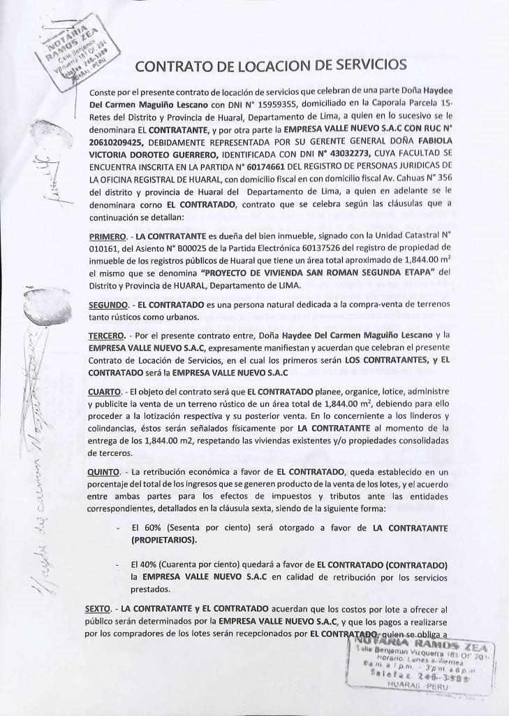 En primer lugar, desmintió categóricamente las afirmaciones que insinuaban la ausencia de un contrato legal entre Valle Nuevo SAC y los propietarios de los terrenos en cuestión. Presentó ante los medios el contrato de locación de servicios, debidamente firmado y legalizado por las partes involucradas, como evidencia sólida de la existencia y validez del acuerdo contractual.