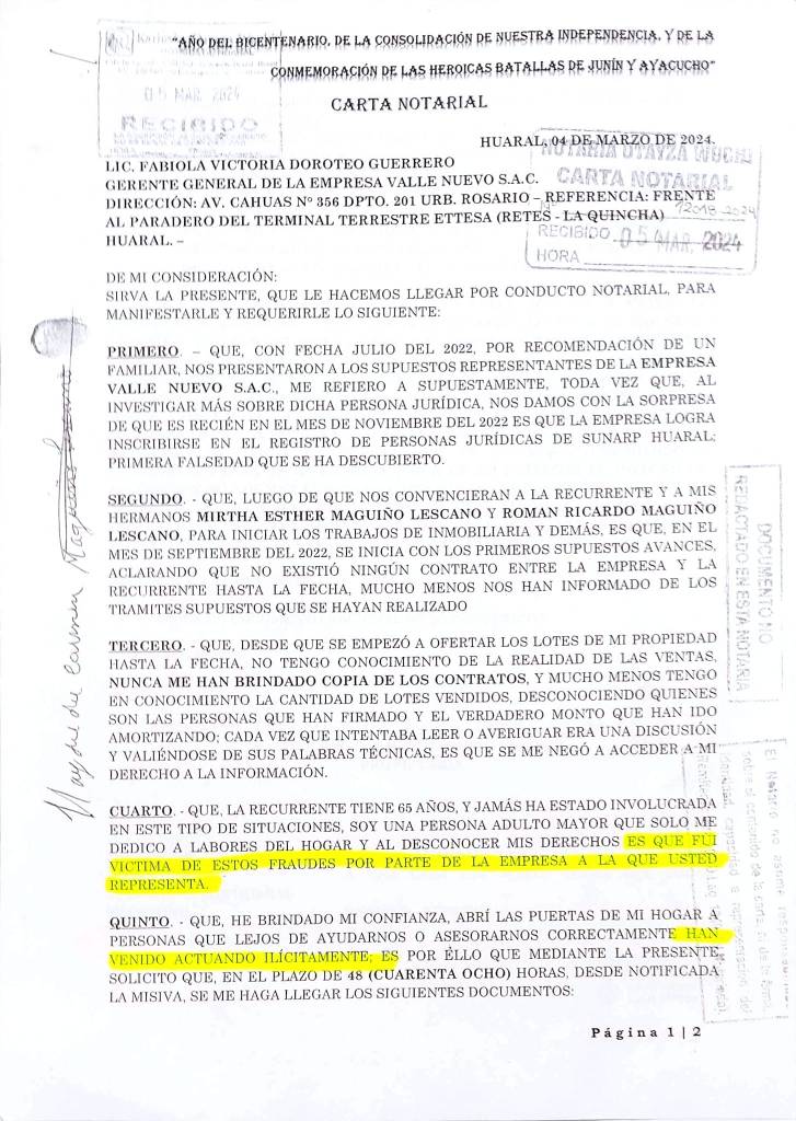 Finalmente, el abogado dejó claro que, ante las acusaciones infundadas de fraude, engaño y de actividades ilícitas que han sido manifestadas mediante Carta Notarial, por parte de uno de los propietarios, Valle Nuevo SAC, tomará todas las acciones legales necesarias para defender sus derechos y hacer cumplir el contrato de prestación de servicios. Subrayó que el respeto a los contratos es fundamental para garantizar la seguridad jurídica. Asimismo, instó a la otra parte a resolver cualquier disputa de manera legal y respetuosa, sin recurrir a difamaciones o acusaciones infundadas.
