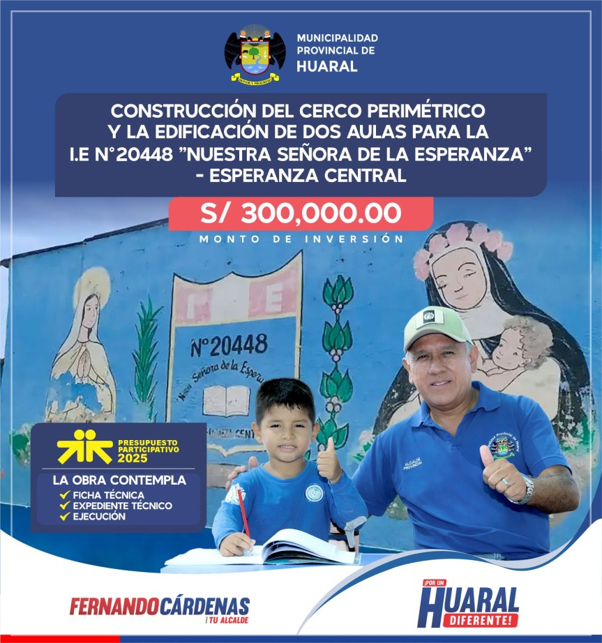 Destacando entre los beneficiarios, la institución educativa N° 20448 «Nuestra Señora De La Esperanza» del Centro Poblado La Esperanza Central, ha sido seleccionada para recibir una inversión significativa de S/. 300.000 (Trescientos mil nuevos soles). Este financiamiento abarcará la elaboración de la ficha técnica, el expediente técnico y la ejecución para la construcción del cerco perimétrico, además de la edificación de dos aulas adicionales para la institución educativa.