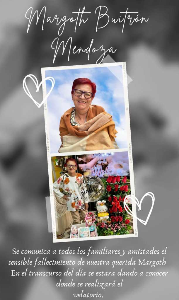 “Con el corazón destrozado comunico a ustedes el fallecimiento de nuestra amada madre Margoth Buitrón Mendoza ocurrido el día de hoy. La mitad de mi alma se va contigo mamá. Estaremos comunicando el lugar del velatorio”, escribió en redes el regidor Hernández.