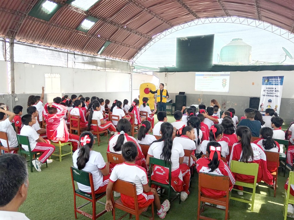 La Municipalidad Provincial de Huaral a través de la Gerencia de Transporte, Tránsito y Seguridad Vial, brindó una importante charla, en el marco de las jornadas de sensibilización en materia de educación vial, «CAMINANDO SEGURO», esta vez a estudiantes de las instituciones educativas, LOS NATURALES y LA HUAQUILLA.