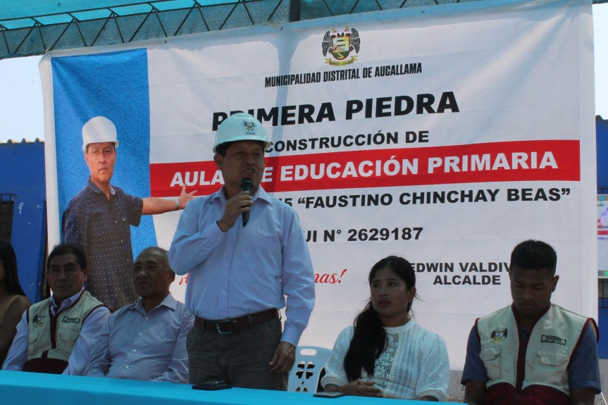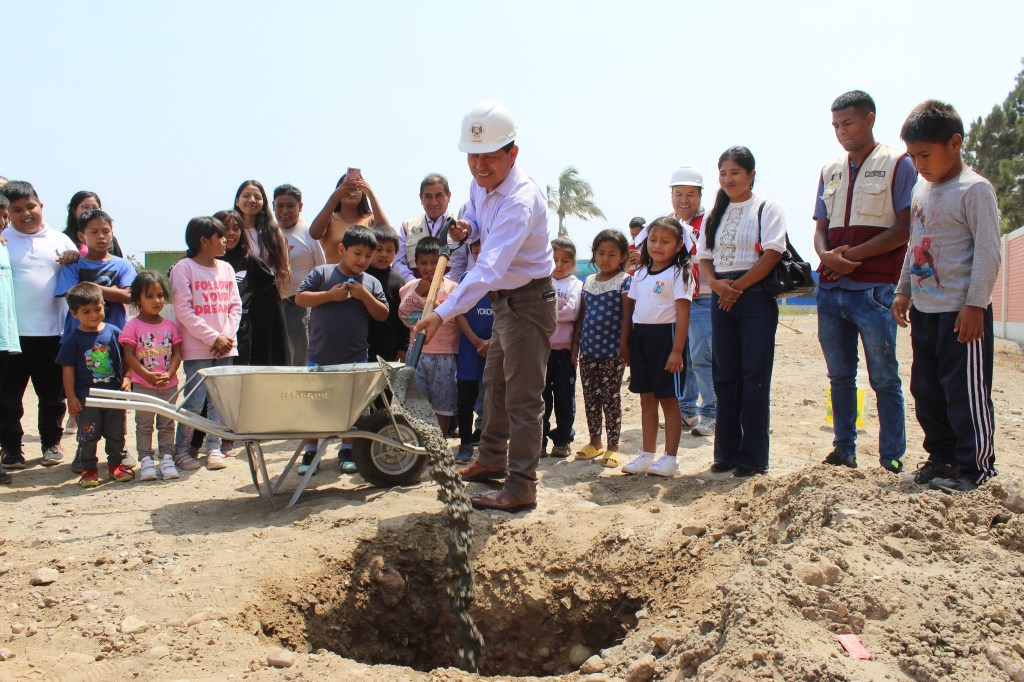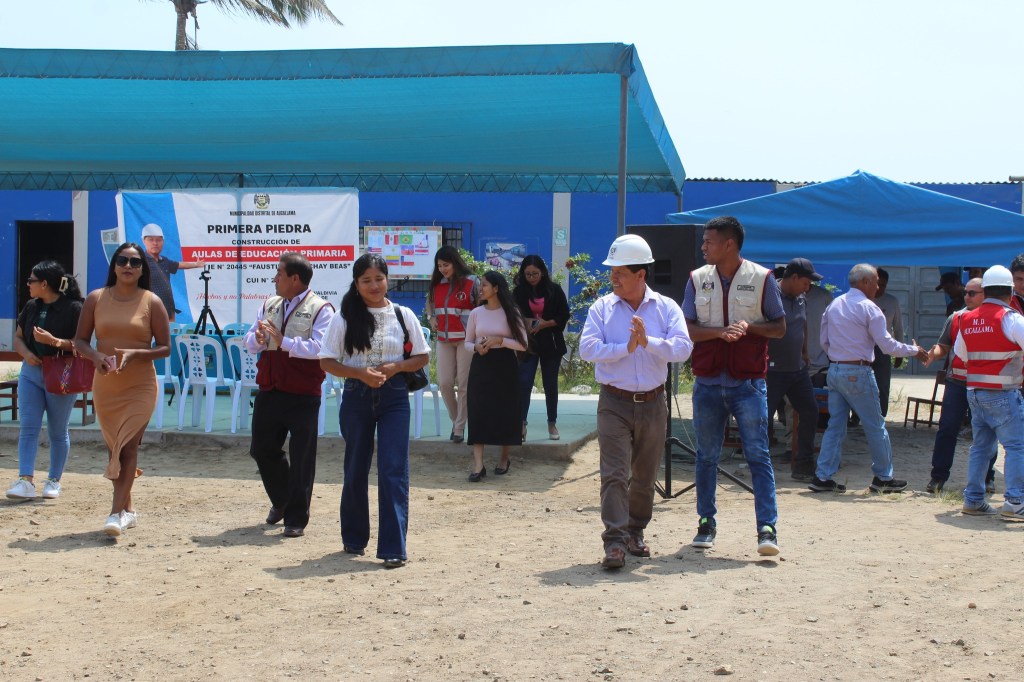 El Ing. Edwin Valdivia, alcalde de Aucallama, fue recibido por la comunidad de la Institución Educativa N° 20445 «Faustino Chinchay Beas» para realizar la ceremonia de Colocación de la Primera Piedra de la obra «Construcción de aulas de educación primaria».