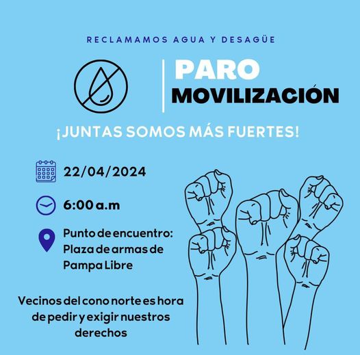 Para tal efecto, han programado una movilización para exigir de una vez se continúe con el proyecto de Agua y desagüe a realizarse el lunes 22 de abril, como punto de concentración 6 am en la Plaza de armas de Pampa Libre.