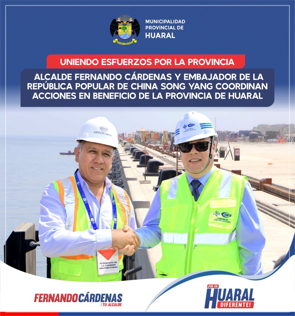 Tras la reunión de la Comisión Multisectorial para el Desarrollo y la Inclusión Social, el alcalde provincial de Huaral, Fernando Cárdenas Sánchez, sostuvo un breve encuentro con el embajador de la República Popular China, Song Yang. Durante la conversación, Cárdenas señaló que el impacto del megapuerto multipropósito afectará no solo a Chancay, sino a toda la provincia en su conjunto.
