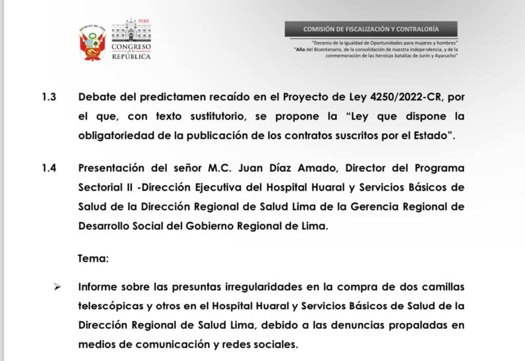 El director del hospital de Huaral, Dr. Juan Díaz Amado, acude al Congreso de la República del Perú para informar sobre las presuntas irregularidades en la compra de dos camillas telescópicas y otros en el Hospital Huaral y Servicios Básicos de Salud de la Dirección Regional de Salud Lima, debido a las denuncias propaladas en medios de comunicación y redes sociales, otros. El congresista Roberto Sánchez lo dio a conocer a través de su cuenta «X».