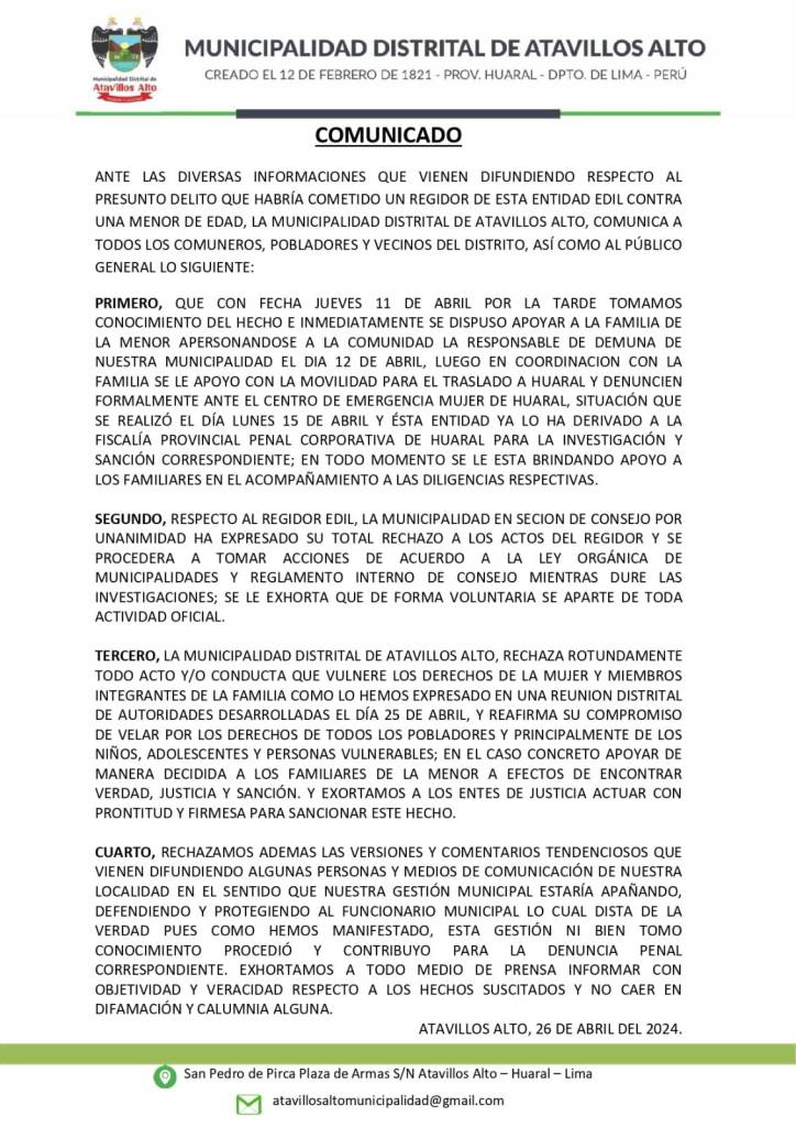 Al respecto la Municipalidad Distrital de Atavillos Alto, emitió un comunicado oficial en respuesta a las informaciones sobre el presunto delito cometido por el regidor en contra de una menor de edad. A continuación, se detallan los puntos clave del comunicado: