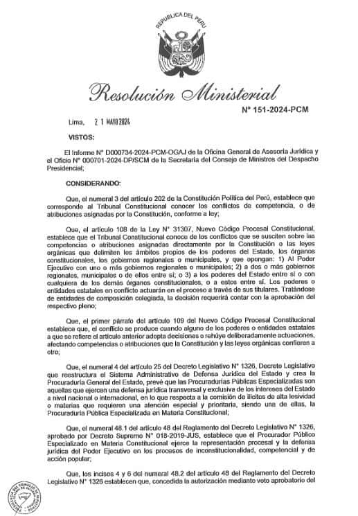 «Disponer que el Procurador Público Especializado en Materia Constitucional ejerza la representación procesal del Poder Ejecutivo en el proceso competencial contra el Ministerio Público y el Poder Judicial, por menoscabo en sentido estricto del adecuado ejercicio de las competencias y funciones de la Presidenta de la República, de acuerdo a lo señalado en la parte considerativa de la presente Resolución Ministerial», se lee en la Resolución Ministerial 151-2024-PCM, firmada por Gustavo Adrianzén.