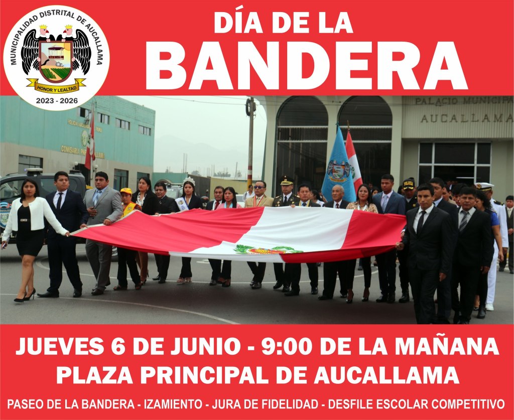 El histórico distrito de Aucallama, conjuntamente con su municipalidad distrital e instituciones tutelares, educativas y organizaciones sociales, realizará la ceremonia de homenaje a nuestros símbolos patrios con ocasión de celebrarse el Día de la Bandera y el 144° Aniversario de la Batalla de Arica.