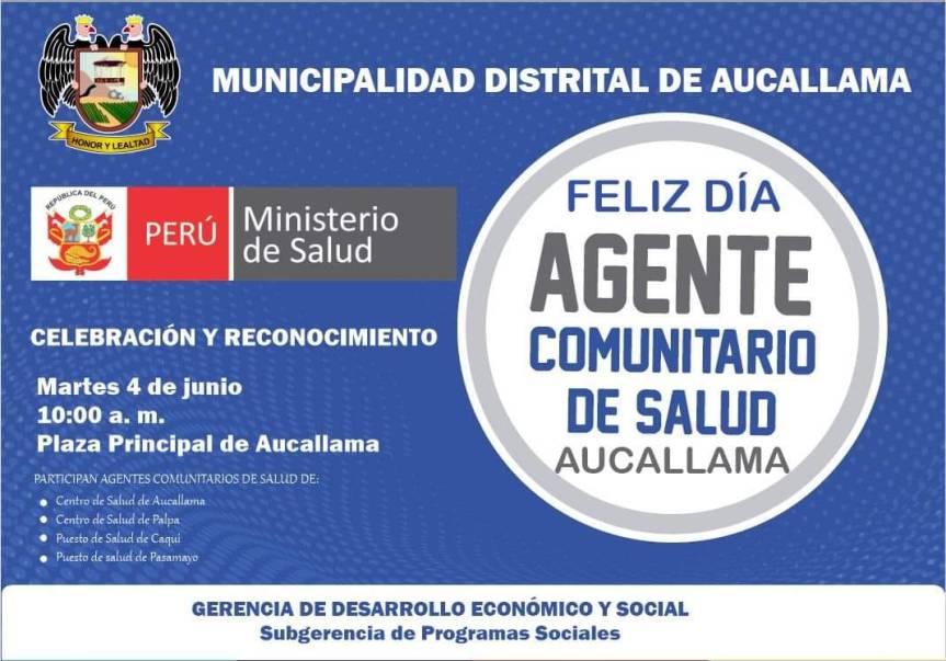 La Municipalidad Distrital de Aucallama realizará una actividad de celebración y reconocimiento al Agente Comunitario de Salud en su día.