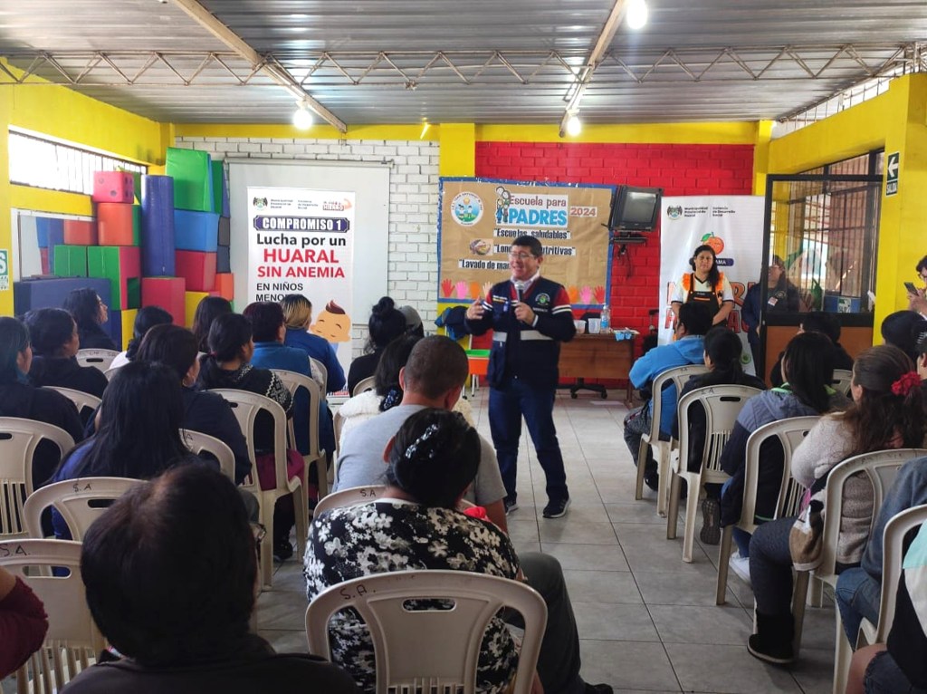 Padres de familia de la Institución Educativa Inicial N° 546 San Antonio, participaron de una charla educativa para la prevención de la anemia, en el cual se brindaron temas fundamentales como la implementación de loncheras saludables, la técnica adecuada de lavado de manos y la desinfección de frutas y verduras.