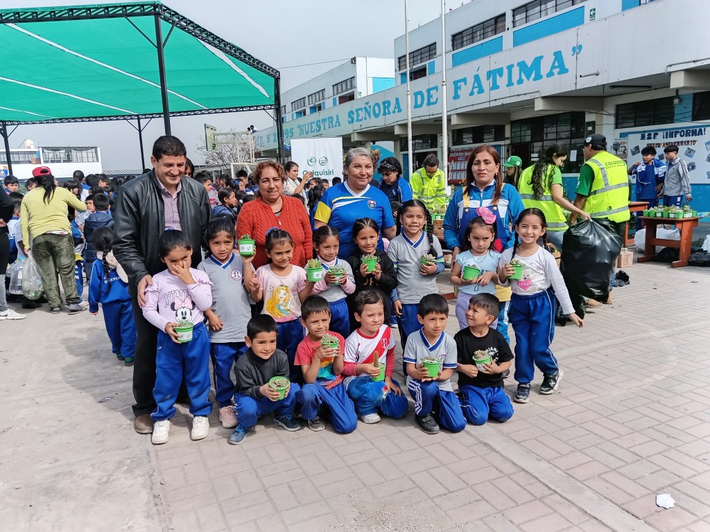 La actividad del Ecotrueque llegó esta mañana hasta la I.E Nuestra Señora de Fátima de Quepepampa. Un total de mil 800 alumnos de inicial, primaria y secundaria participaron llevando sus botellas plásticas para recibir a cambio una plantita.
