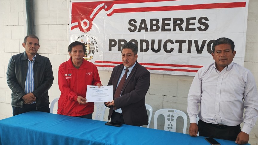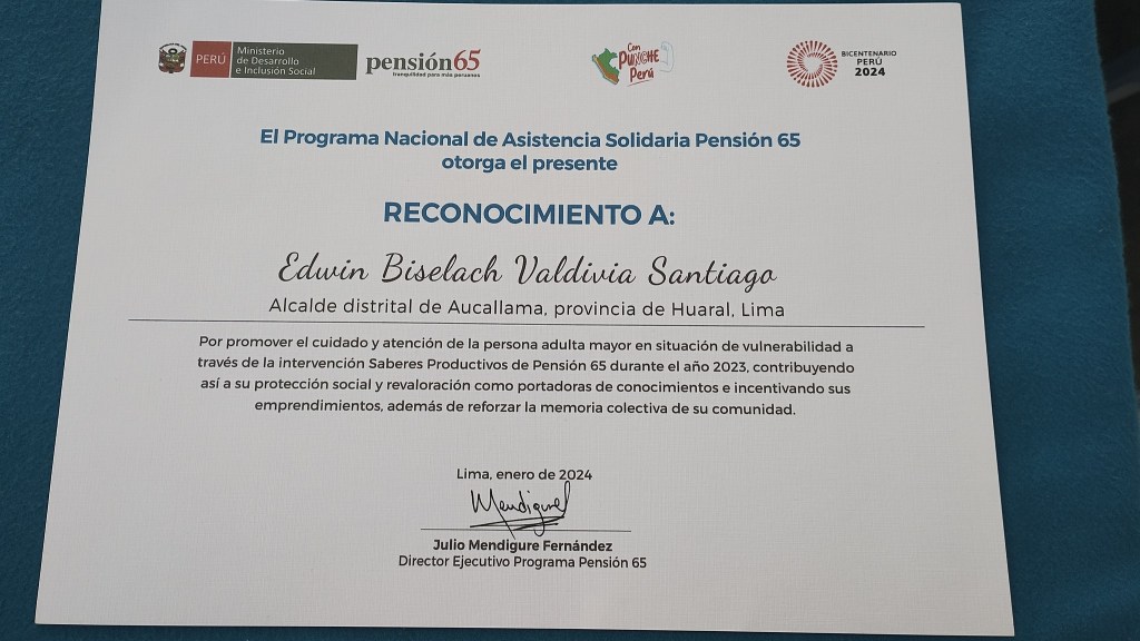 Gustavo Manrique La Rosa, coordinador de la Unidad Territorial del programa en esta parte del país, hizo entrega de un Diploma de Reconocimiento al alcalde de Aucallama por promover el cuidado y atención a la persona adulta mayor en situación de vulnerabilidad, mediante Saberes Productivos 2023.