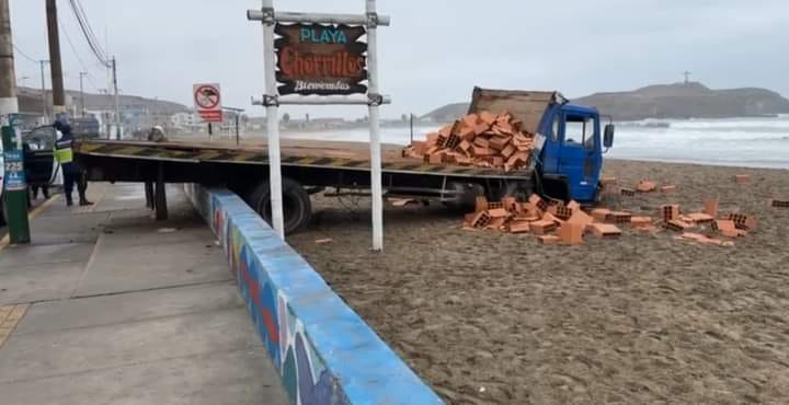 Un camión volvo que transportaba ladrillos, protagonizó un impactante accidente al atravesar el muro que divide la vereda de la playa Chorrillos.