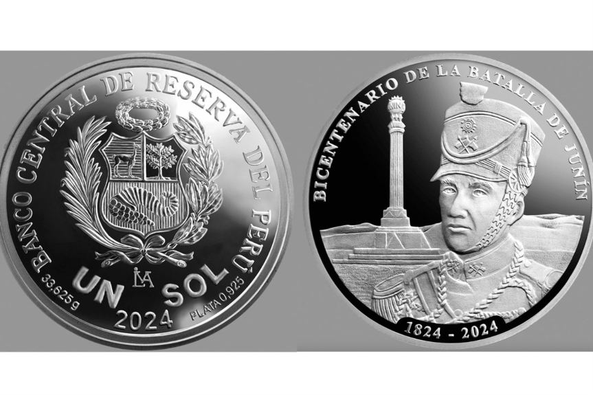 El Banco Central de Reserva (BCR) ha emitido hoy una moneda de plata alusiva al bicentenario de la batalla de Junín, con fines numismáticos.