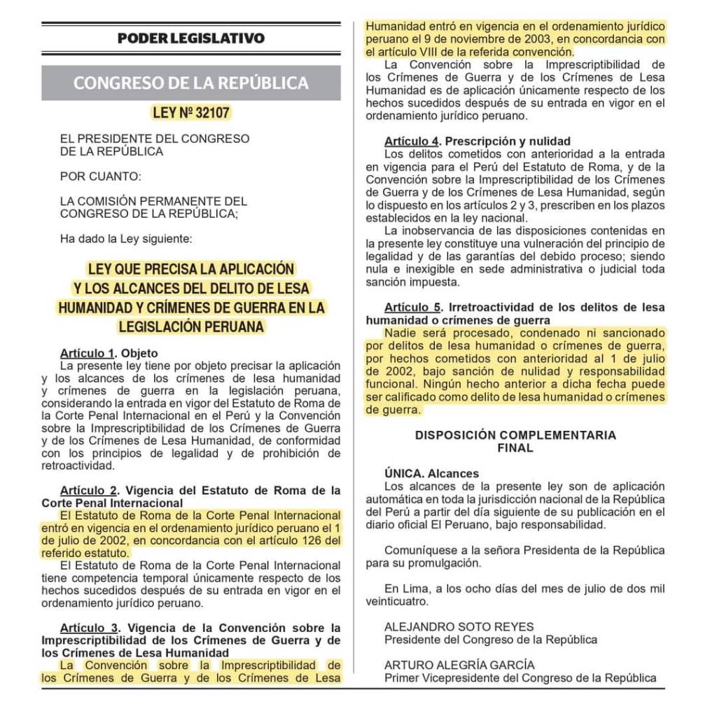 3. El Perú aprobó en 2003 la «Convención sobre la imprescriptibilidad de los crímenes de guerra y de los crímenes de lesa humanidad» mediante la R. Leg. N° 27998, con una reserva, limitó su eficacia a «los crimenes cometidos con posterioridad a su entrada en vigor para el Perú», es decir de 2003 en adelante.