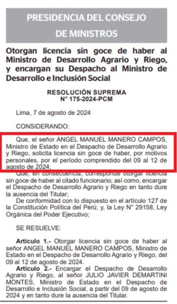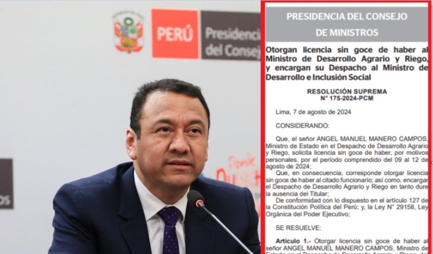 Ángel Manero Campos será reemplazado por el ministro de Desarrollo e Inclusión Social, Julio Demartini Montes, quien asumirá sus funciones durante los días de ausencia.