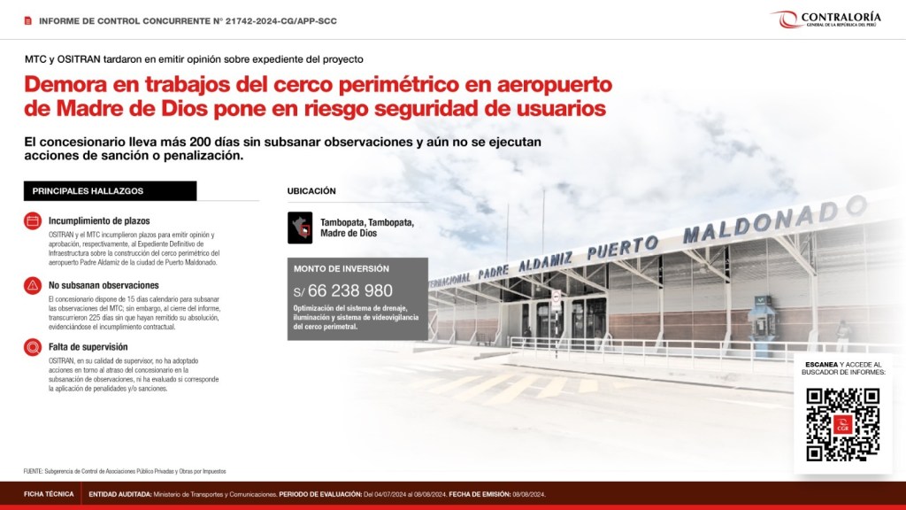 La Contraloría General de la República advirtió que el Ministerio de Transportes y Comunicaciones (MTC) y el Organismo Supervisor de la Infraestructura de Transporte de Uso Público (OSITRAN) incumplieron los plazos para formular su opinión y revisión del Expediente Definitivo de Infraestructura (EDI) del proyecto de mejora del sistema de drenaje, iluminación y sistema de videovigilancia del cerco perimétrico del Aeropuerto Internacional Padre Aldamiz, en el departamento de Madre de Dios. Además, OSITRAN no toma medidas sobre la demora del concesionario en subsanar las observaciones, dilatando la ejecución de la obra y poniendo en riesgo la seguridad de usuarios y la infraestructura aeroportuaria.