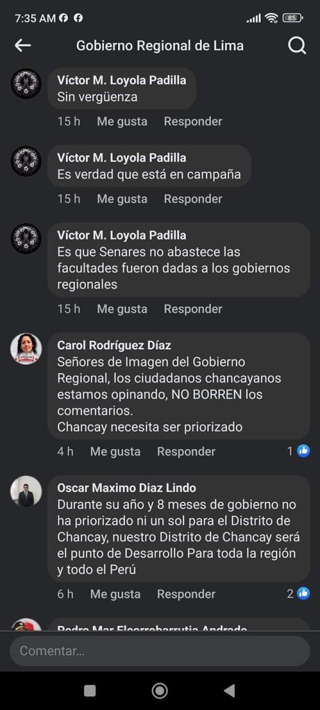 Nota: Hay que indicar que una de las cibernautas que observaba la conferencia a través de la página del Gobierno Regional de Lima increpó a los integrantes de imagen porque según manifiesta habrían estado borrando los comentarios de la población.