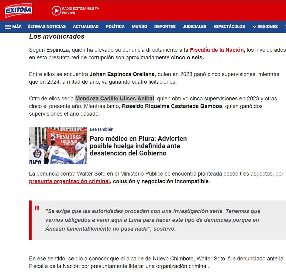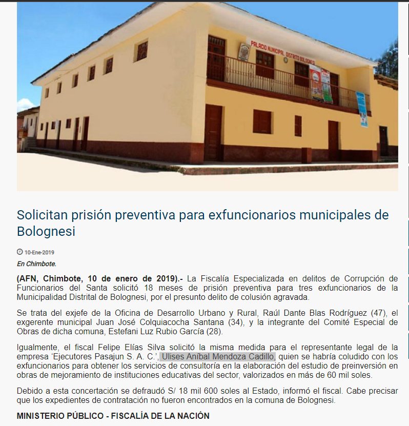 Uno de los denunciados es ULISES ANIBAL MENDOZA CADILLO, con Ruc: 10321149869, y registra un sinnúmero de procesos de selección ganadas con su razón social, casi todas en la región Ancash.