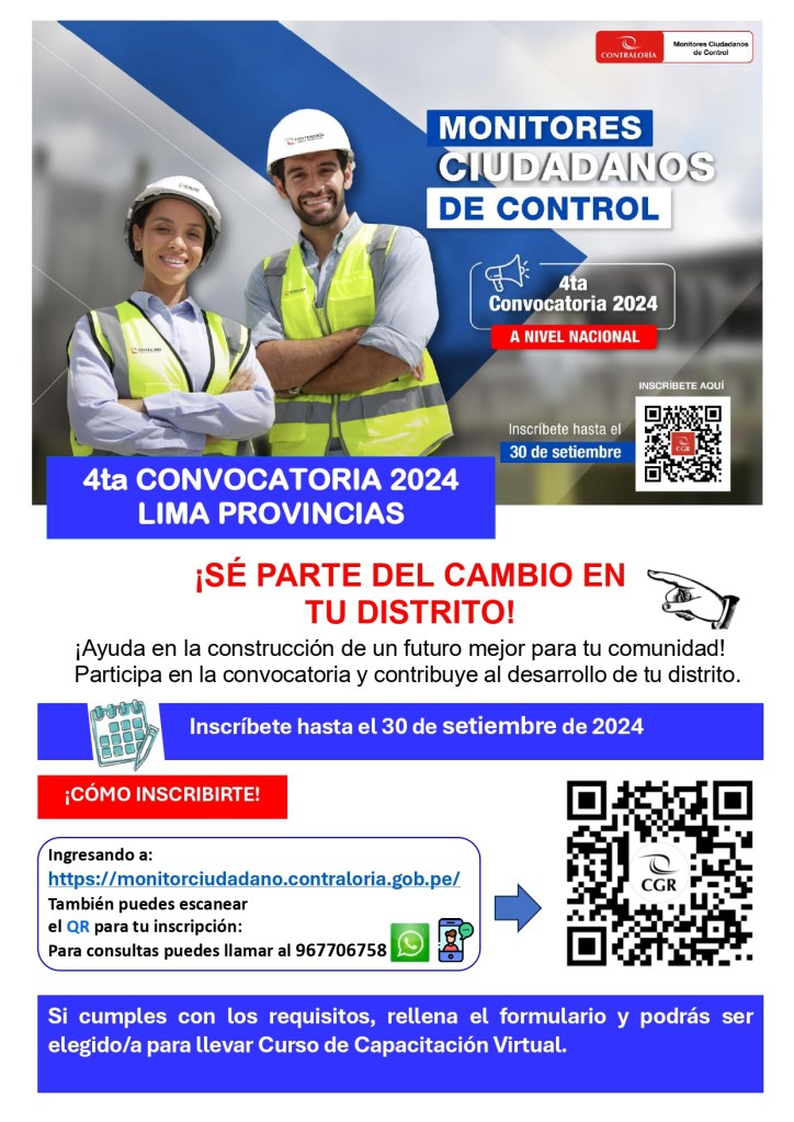 Los interesados, deberán inscribirse mediante el siguiente enlace https://monitorciudadano.contraloria.gob.pe/ cuyo plazo vence el próximo 30 de setiembre del 2024. Además, para cualquier consulta pueden contactarse al celular 967 706 758 y/o al correo electrónico jquirita@contraloria.gob.pe