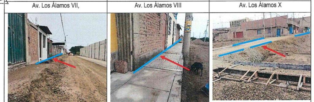 En la avenida Los Álamos VII y VIII, se observó que se han realizado trabajos de encofrado para las veredas sin que se hayan erigido los muros de contención de 1.5 metros, a pesar de que, según el expediente técnico, la ejecución de los muros debería haberse llevado a cabo antes de la construcción de las veredas.