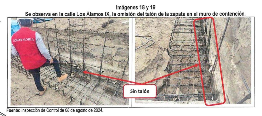 El Informe de Hito de Control N°23812-2024-CG/GRLP-SCC reveló que los muros de contención se edificaron en dirección opuesta a la orientación original establecida en el expediente técnico. Esta situación compromete la funcionalidad y estabilidad del muro, incrementando su vulnerabilidad a fallas por deslizamiento.