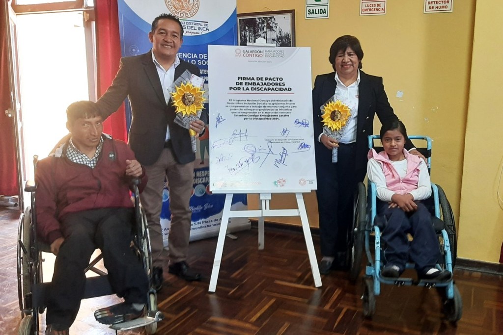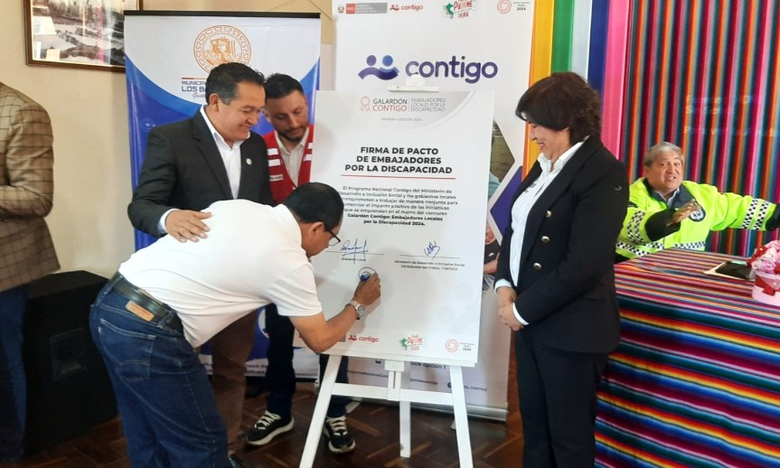 Como símbolo de compromiso para trabajar de manera articulada en beneficio de los usuarios y potenciales usuarios del programa, se realizó la firma de pacto “Embajadores por la discapacidad” en la que participaron la directora ejecutiva de Contigo, Orfelina Arpasi, y los alcaldes de las municipalidades distritales Baños del Inca, Llacanora, Colasay y Tabaconas, entre otras autoridades.