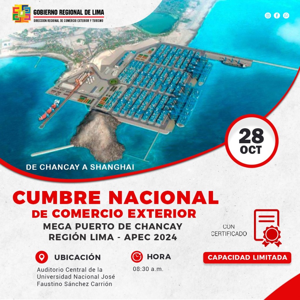 El Gobierno Regional de Lima, a través de la Dirección Regional de Comercio Exterior y Turismo – Dircetur, los invita a participar en la Cumbre Nacional de Comercio Exterior – Mega Puerto de Chancay, que se llevará a cabo en la Región Lima, en el marco de las actividades de APEC 2024, con el objetivo de promover y fortalecer la comunidad exportadora en la Región Lima como en el ámbito nacional. Asimismo, se destacarán los beneficios y el impacto que el Mega Puerto de Chancay generará en el desarrollo económico y comercial del Perú.