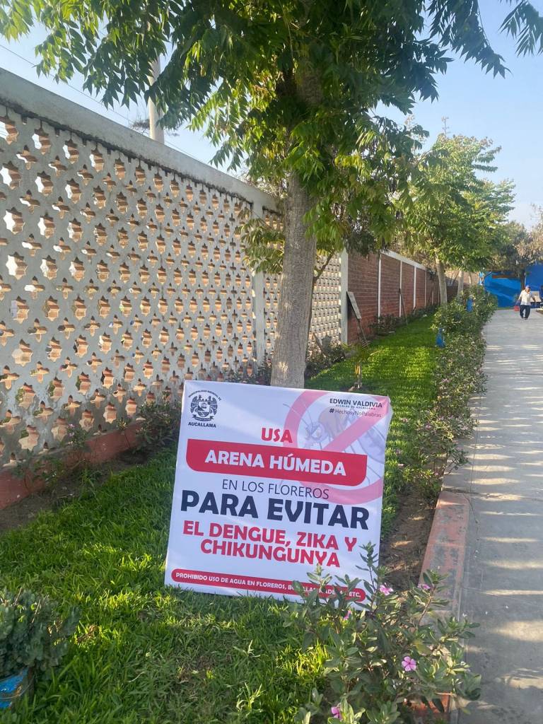 La Municipalidad Distrital de Aucallama, mediante la Gerencia de Servicios Municipales y Gestión Ambiental, ha instalado cilindros con arena para ser usados en los floreros, como forma de erradicar el agua, principal elemento para fomentar la presencia del zancudo y la siembra de huevos.