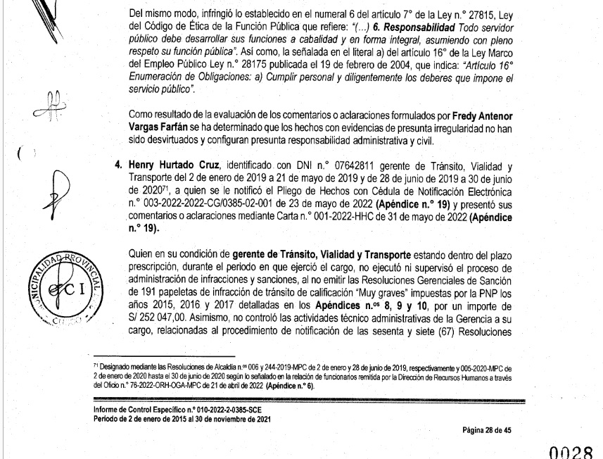 Henry Hurtado Cruz, estando dentro del plazo de prescripción, durante el periodo que ejerció el cargo, no ejecutó ni supervisó el proceso de administración de infracciones y sanciones, al no emitir resoluciones gerenciales de sanción de 191 papeletas de infracción de tránsito de calificación “muy graves” impuestas por la PNP en los años 2015,2016 y 2017 por un importe de S/252,047.00 soles.