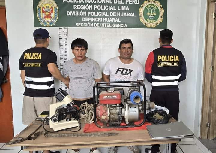 En el asiento posterior se halló una Lap Top HP, un microscopio color crema, que habrían sido robados a la empresa Sonasyl EIRL. Una bomba de agua marca Honda, una sierra, una pata de cabra, una aspiradora y una soga, que fueron incautadas y decomisadas. Se procedió luego a su traslado a la DEPINCRI Huaral, para continuar las investigaciones.