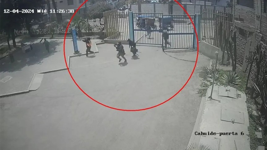 Las cámaras de seguridad captaron el momento del asalto, ocurrido minutos antes de las 11:30 a.m.: en las imágenes, se ve hasta a seis bandidos llegar en dos mototaxis, tras lo cual irrumpen en el recinto.