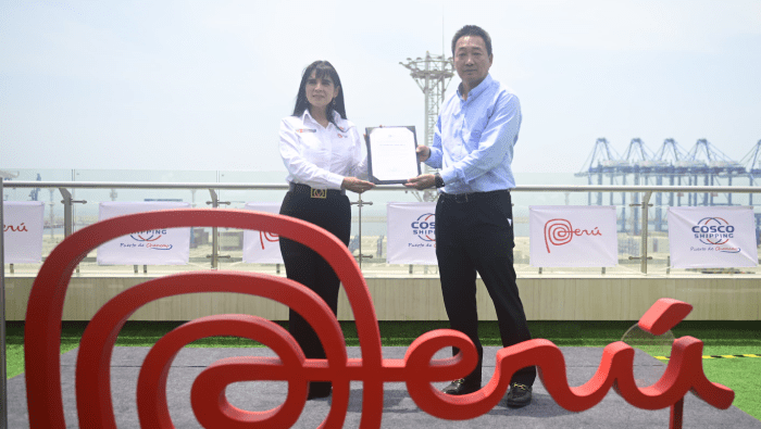 La ministra de Comercio Exterior y Turismo, Desilú León Chempén, entregó la licencia de uso de la Marca Perú a Cosco Shipping Ports Chancay Perú S.A., empresa que administra el Megapuerto de Chancay, ubicado en la provincia de Huaral, región Lima, que busca consolidarse como el principal “hub” portuario del Pacífico Sur, con salida directa al continente asiático.