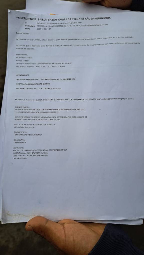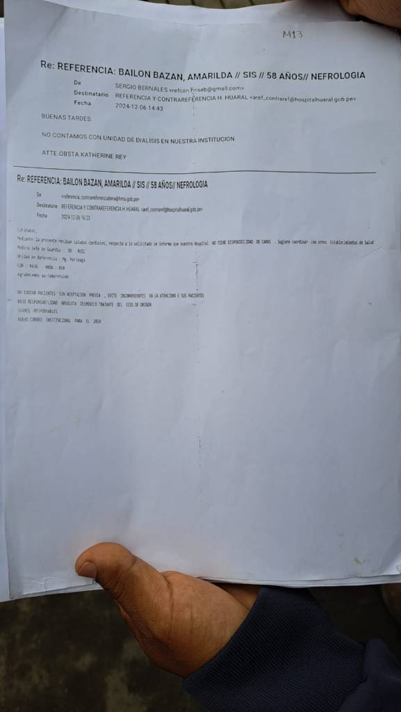 Por ello, pide al director del hospital el apoyo para la gestión de un hospital en la ciudad capital, ya que él no cuenta con los recursos económicos para el pago de una diálisis que estaría superando los 2000 mil soles, y que en una semana tendría que tener un aproximado de 6000 mil, debido a la cantidad de intervención que se requiere.