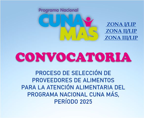 La publicación se realiza con la finalidad de orientar la información hacia las personas naturales y jurídicas, asociaciones de comerciantes, pequeños empresarios y otros, publicando además el cronograma del proceso de selección de proveedores de alimentos por los Comités de Gestión de la Zona I/LIP, Zona II/LIP y Zona III/LIP.
