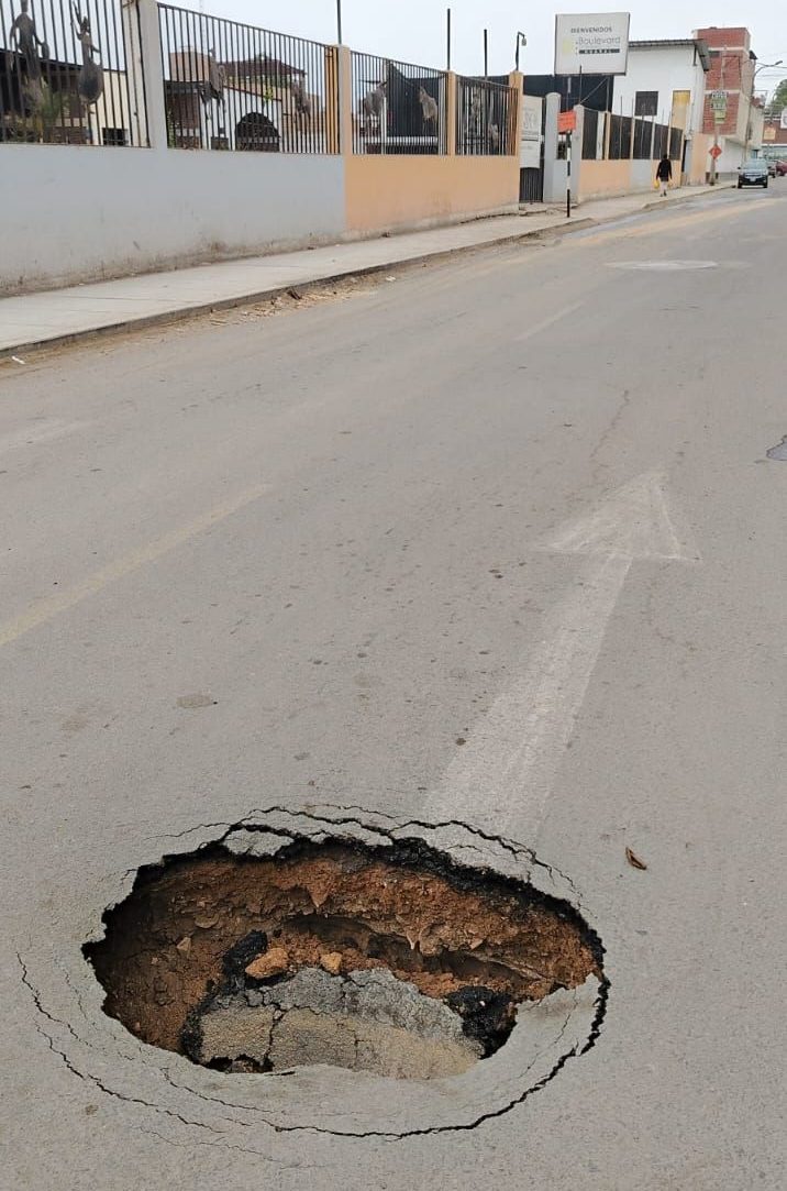 «Amigos de la prensa, mira cómo se está deteriorando la pista frente al hotel de Warmy, se ha hecho un cráter, llamé a Emapa y no responde, se está filtrando agua, probablemente sea las instalaciones que se hicieron para agua potable, que están mal hechas y así no van a durar definitivamente, por favor publicar y dar a conocer a las autoridades respectivas», se puede leer la queja de un seguidor.