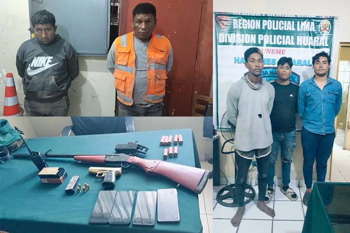 En dos operativos, personal policial detuvo a cinco personas que en su poder se les hallaron 4rm4s de fuego, celulares, equipos de comunicación fueron detenidos por los presuntos delitos de tráfico de terrenos en Aucallama, Huaral.